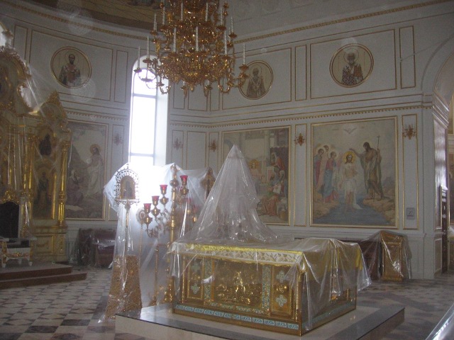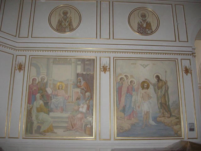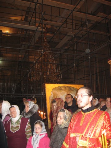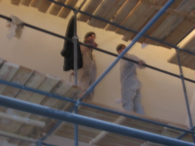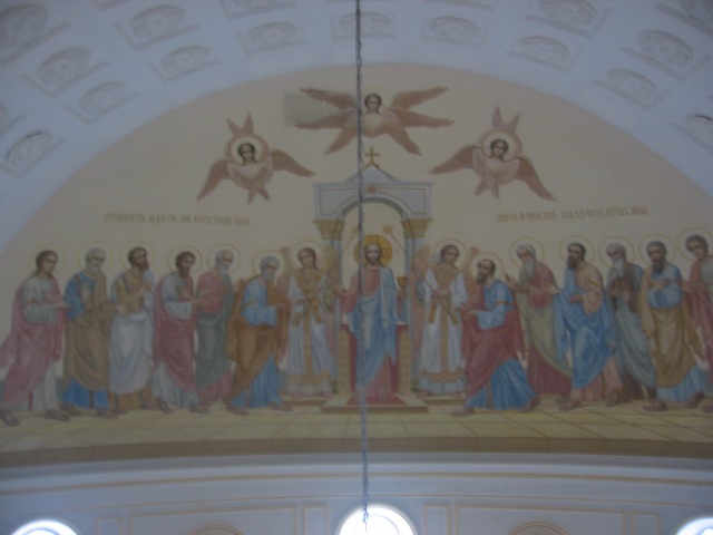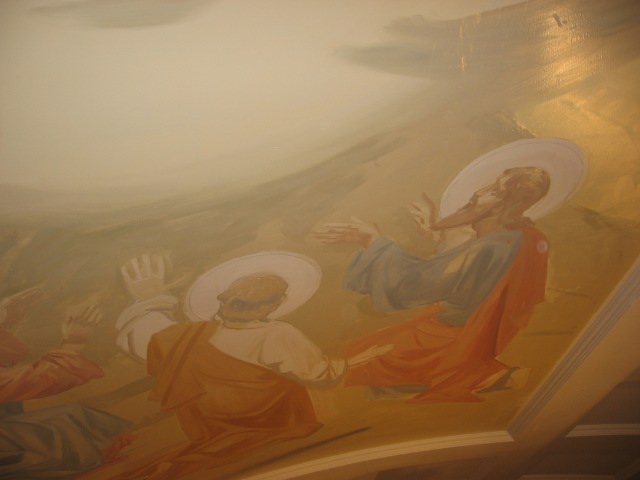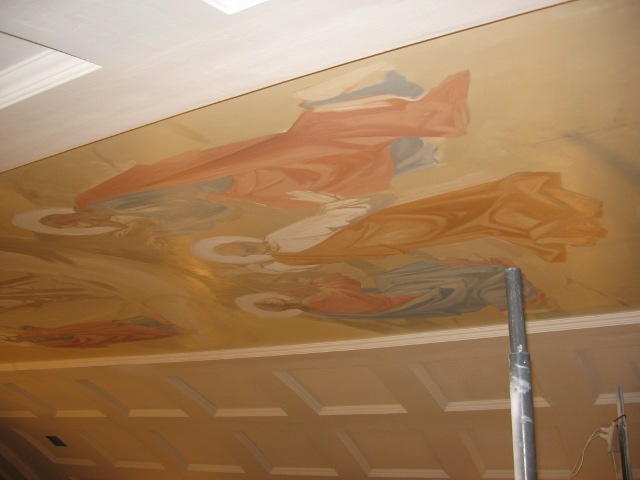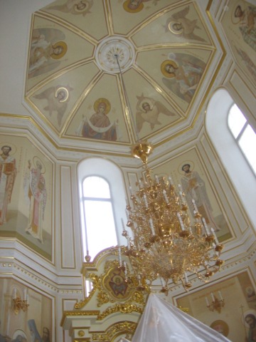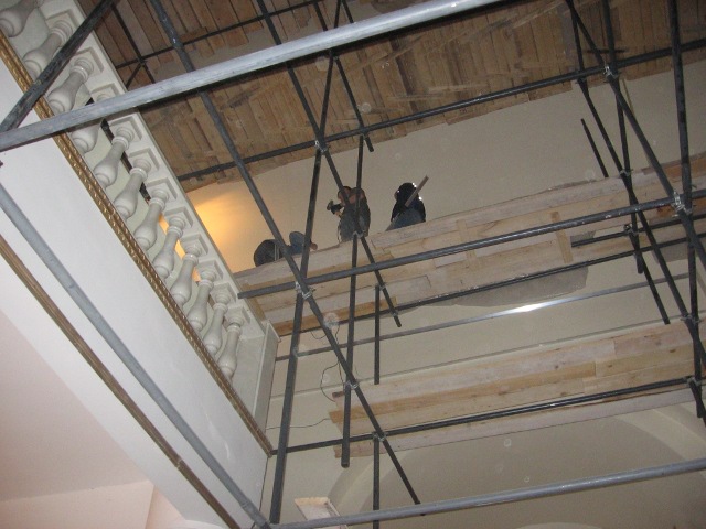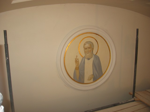 А также Владыка поднялся на строительные леса и осмотрел работу художников, позолотчиков и мастеров по отделки сводов потолка. Сделал необходимые указания по выдержке графика работ. Чтобы рабочие сдавали свои объекты в строго установленное время согласно утверждённого графика. "Так как мы все ограничены строгими временными рамками церковных праздников" - сказал Владыка.