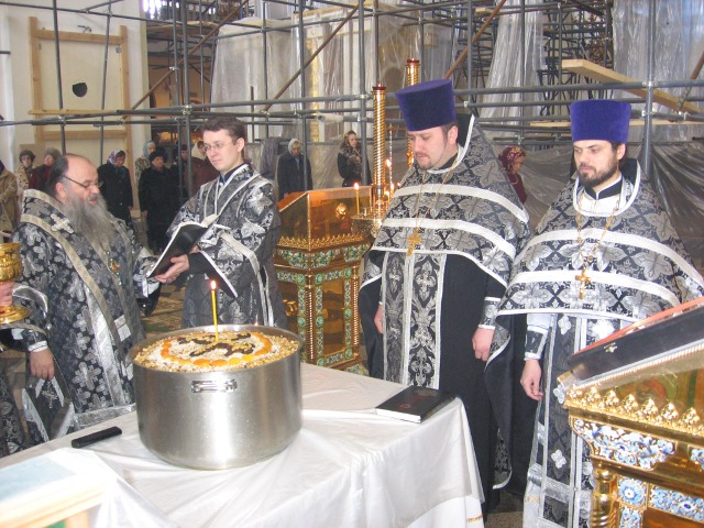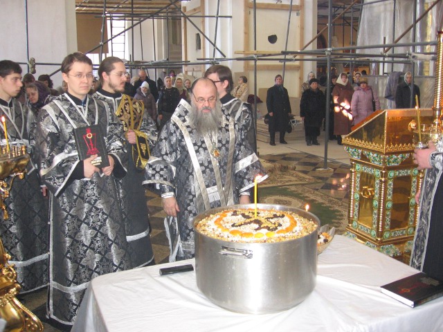 После литургии митрополитом Варсонофием был прочитан молебный канон великомученику Феодору Тирону и благословение колива, которое затем было роздано прихожанам собора.