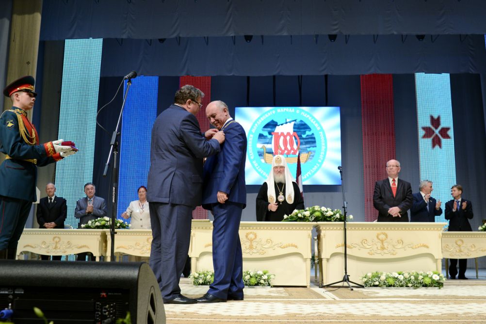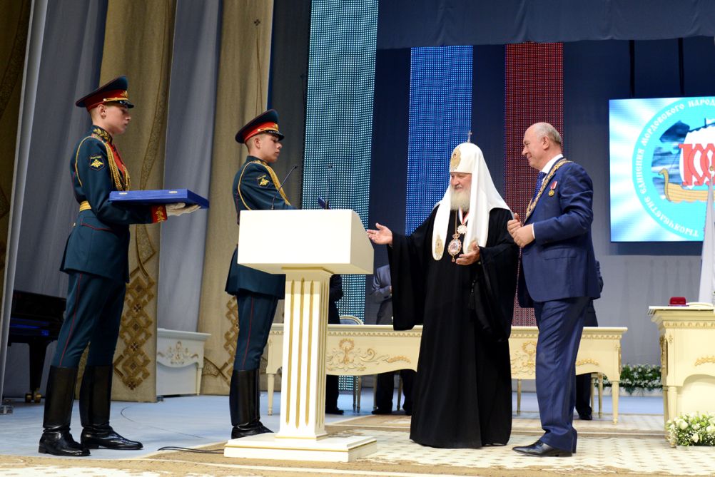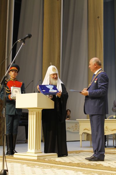 Затем В.Д. Волков наградил Святейшего Патриарха Кирилла высшей наградой Республики Мордовия — орденом Славы I степени.