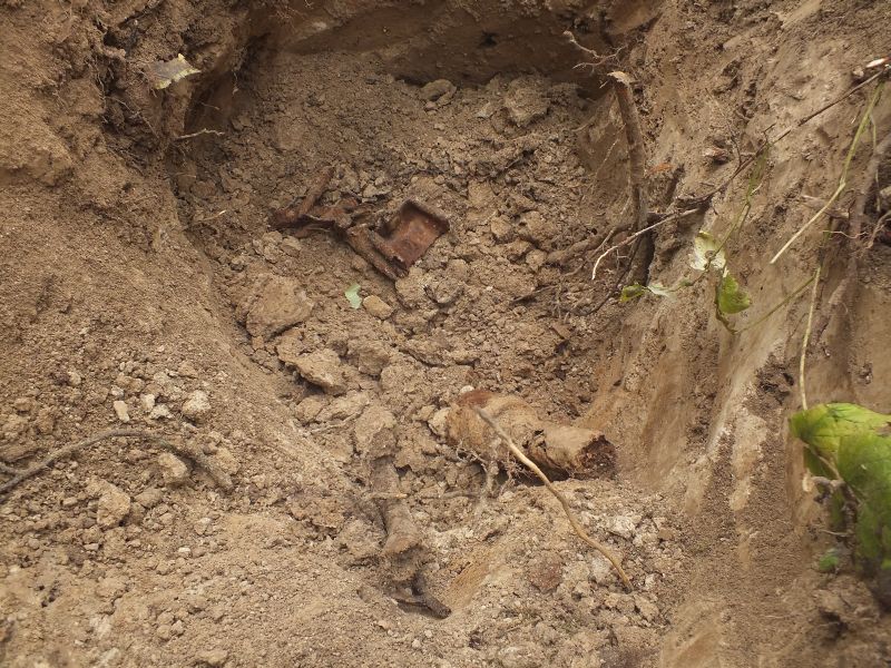 18 августа 2012. Подмарёв Андрей. …Шли на расстоянии двадцати метров, так чтобы видеть друг друга. После сорока минут поиска, Олег Владимирович заметил щупом что-то металлическое. Потом он позвал меня и Павла. Через несколько минут раскопок мы наткнулись на ботинки бойца и начали копать очень аккуратно, чтобы не потерять ничего, что с ним лежало. После ботинок мы заметили ноги, затем косточки рёбер и мелкие кусочки черепа. На бедре у солдата были найдены бумага и кусочек карандаша. Ни документов, ни медалей найдено не было. Но мы всё-таки рады и тому, что нашли советского солдата (О.В. нам объяснил, что у советских солдат на пуговице было четыре дырки). Посередине раскопок пошёл дождь, но мы не переставали копать. Завершив раскопки, мы всё сложили в мешки, и пошли в лагерь, запомнив место, где был найден боец.