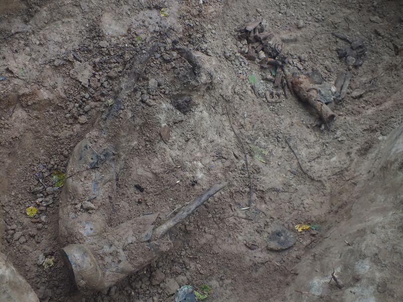 Вскрывали захоронение достаточно долго. Сначала, как почти археологи, расчистили всё, затем сфотографировали и только потом стали снимать останки. Кроме уже названных боеприпасов в захоронении нашли: пуговицы, пряжку от ремня, индивидуальный пакет (бинт), металлическую коробку непонятного предназначения, карандаш, а ещё солдат был обут в ботинки с подковками.