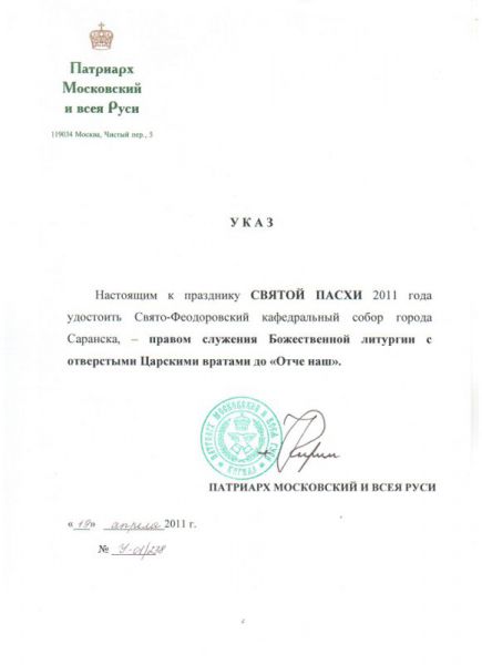 31 декабря 2012 года, Управляющий делами Московской Патриархии, митрополит Саранский и Мордовский Варсонофий совершил молебное пение на новолетие в Свято-Феодоровском кафедральном соборе города Саранска.