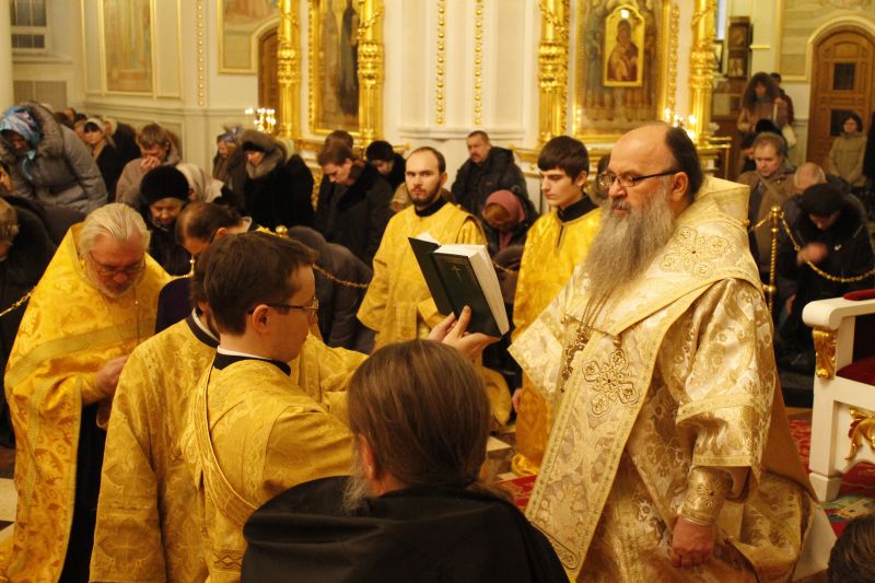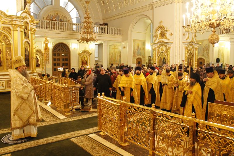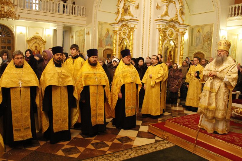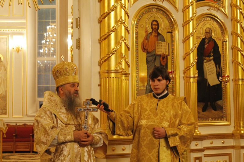 Перед началом молебна Высокопреосвященнейший Владыка обратился к собравшимся с просьбой поблагодарить Бога за все блага которые он доровал нам и попросить прощение у Него за все свои прегрешения в уходящем году, а так же призвал помолиться о себе, о своих родных и близких, о Православной Церкви, о Мордовии, чтобы Господь даровал ей процветание и о всех православных христианах и пожелал всем в новом году счастья и благополучия.