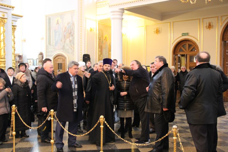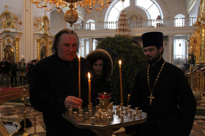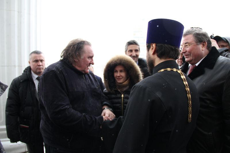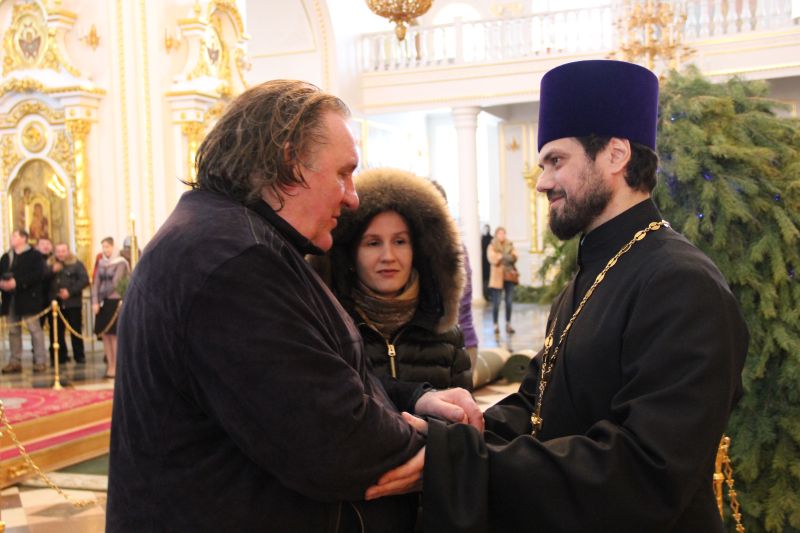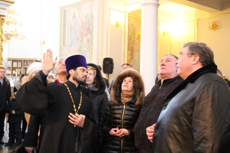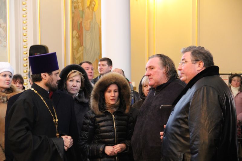 У входа в кафедральный собор гостя встречал секретарь Саранской епархии протоиерей Виктор Хохлов, который рассказал актеру о истории собора, о духовности и о православии, после чего Жерар Департье приложился к иконе Рождества Христова и поставил свечу о здравии и благополучии себя и своих близких.