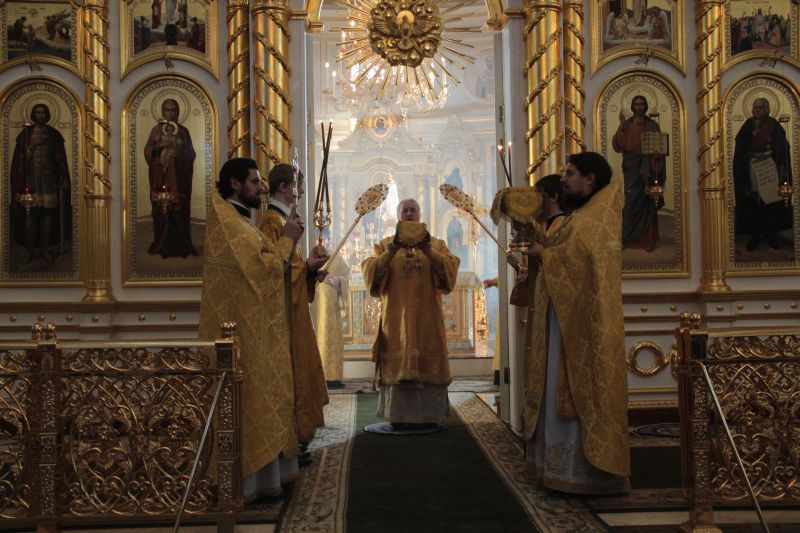 Его Преосвященству сослужили: секретарь Саранской епархии протоиерей Виктор Хохлов; директор детской Воскресной школы при кафедральном соборе протоиерей Павел Горбунов и духовенство собора.