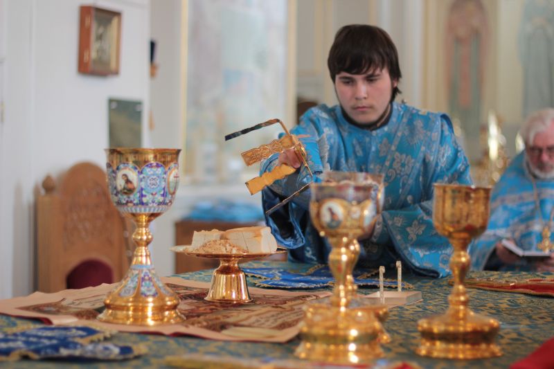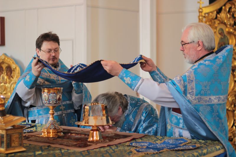 После заамвонной молитвы Преосвященнейший Владыка Илия совершил поклонение Честному и Животворящему Кресту Господню и славление у иконы Благовещения Пресвятой Богородицы.