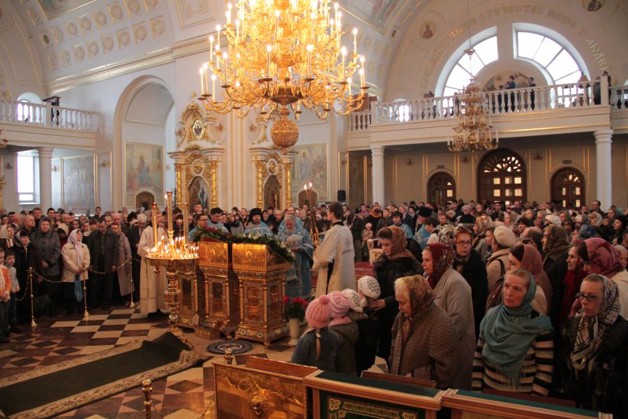 7 апреля 2013 года, в неделю 3-ю Великого поста, Крестопоклонную, праздник Благовещения Пресвятой Богородицы и день преставления святителя Тихона, Патриарха Московского и всея России, Преосвященнейший Илия, епископ Рузаевский, викарий Саранской епархии совершил Божественную литургию святителя Василия Великого в Свято-Феодоровском кафедральном соборе города Саранска.
