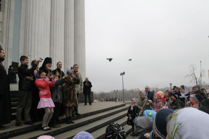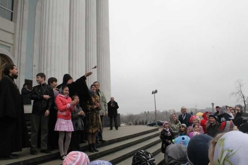 После богослужения в праздник Благовещения Преосвященнейший Владыка Илия вместе с учащимися детской Воскресной школы при кафедральном соборе выпустил в небо воробьев и синиц с крыльца Свято-Феодоровского кафедрального собора.