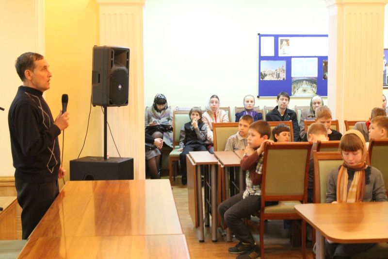 Перед учащимися Воскресной школы выступил педагог дополнительного образования Дворца детского творчества Хмельков С.А. Он рассказал ученикам о видах скворечников, о том как должен быть устроен скворечник и где его лучше размещать.