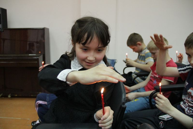 Из пансионата мы поехали в республиканский социальный приют для детей и подростков «Надежда». И вновь от наших автомобилей до зала, в котором собрались воспитанники приюта и их воспитатели, Благодатный Огонь несли под торжественные пасхальные песнопения. От святого Огня дети и взрослые зажгли свечи. Потом они будут зажигать их в молельной комнате приюта. Ребята восхищенно смотрели на сияющие огоньки свечей – и в их глазах стояла искренняя радость.