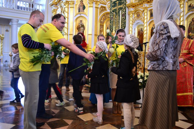 После богослужения по благословению Высокопреосвященнейшего Владыки активисты Союза Православной молодежи Мордовии поздравили всех девушек и женщин в соборе с православным женским днем, даря представительницам прекрасного пола по белой розе и открытке.