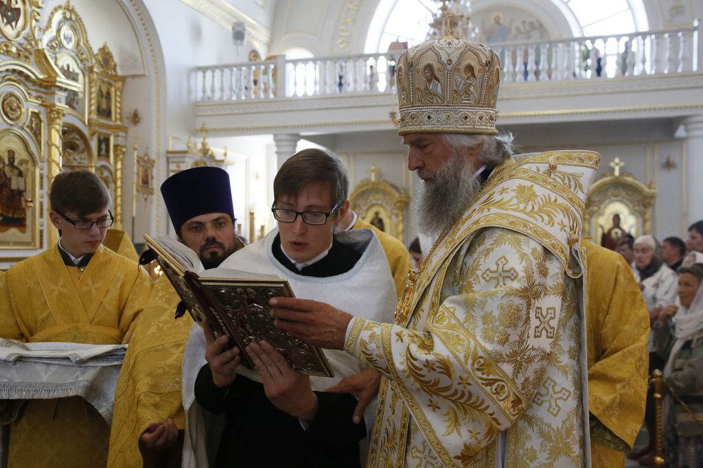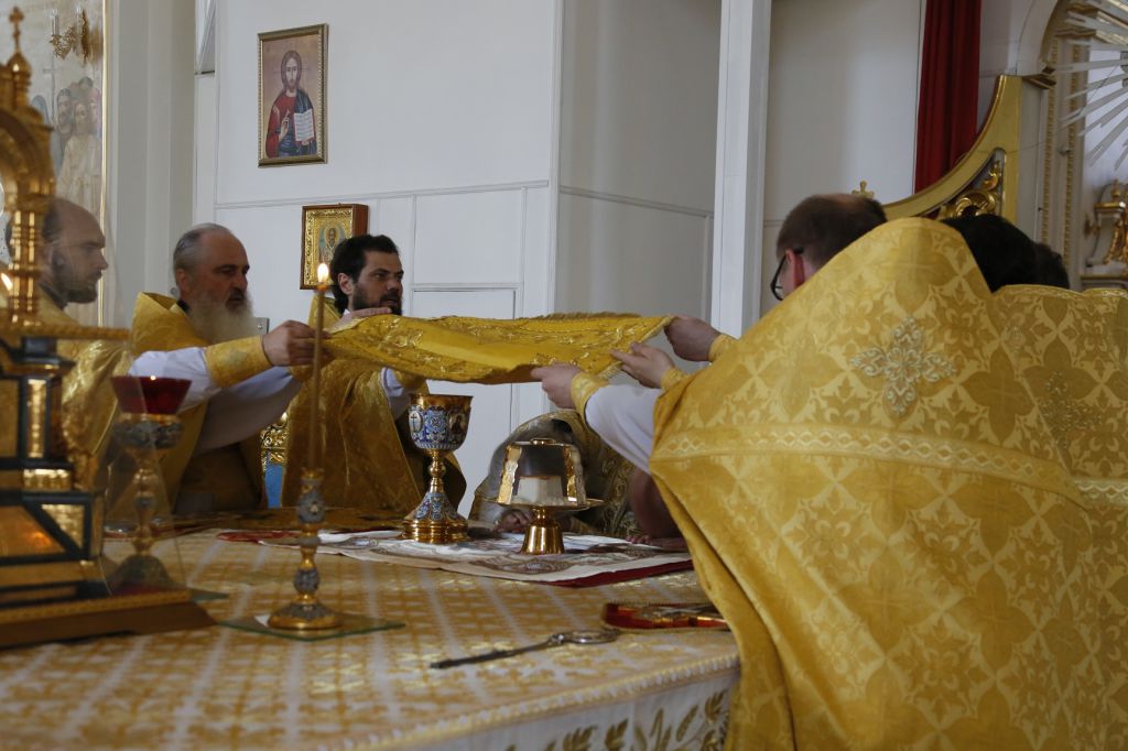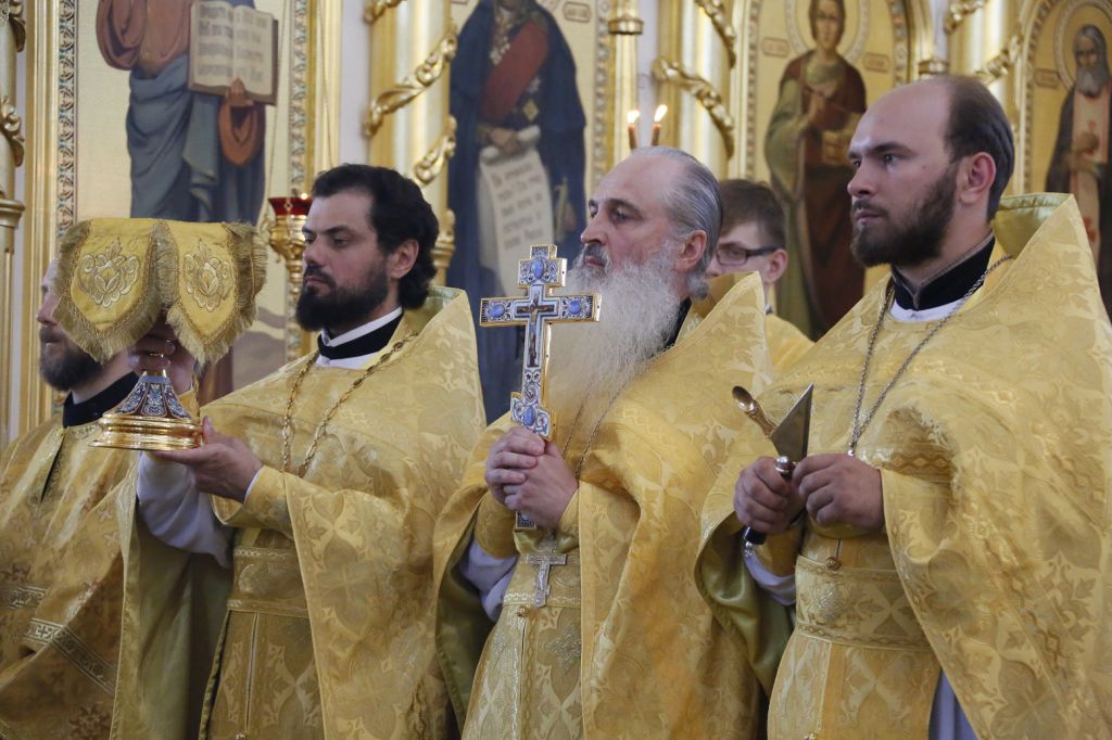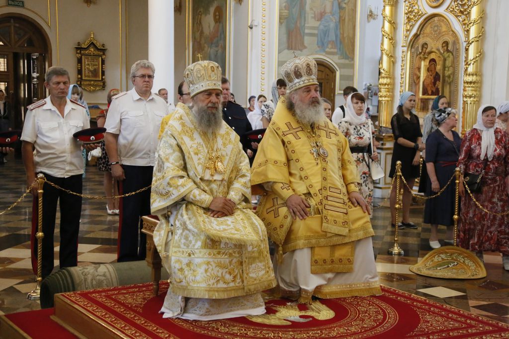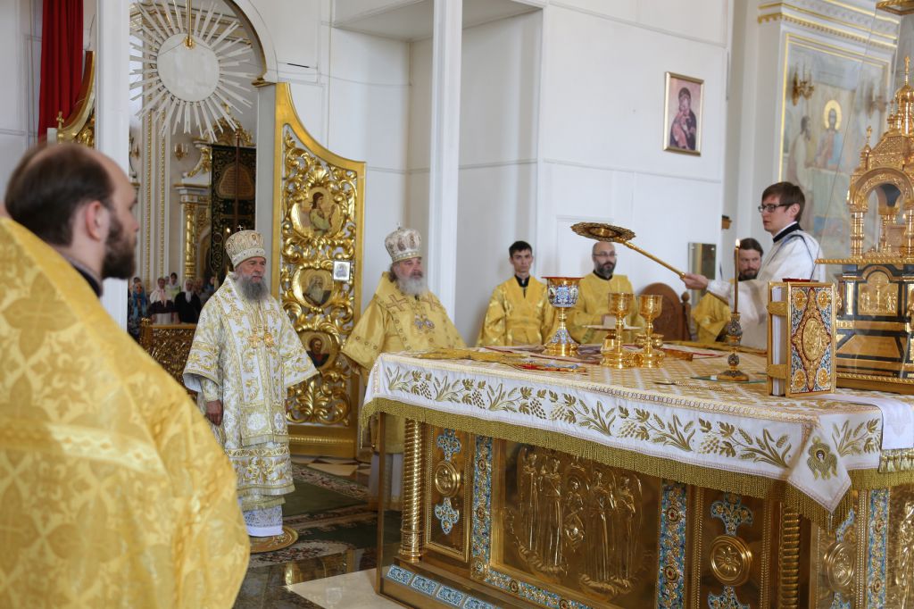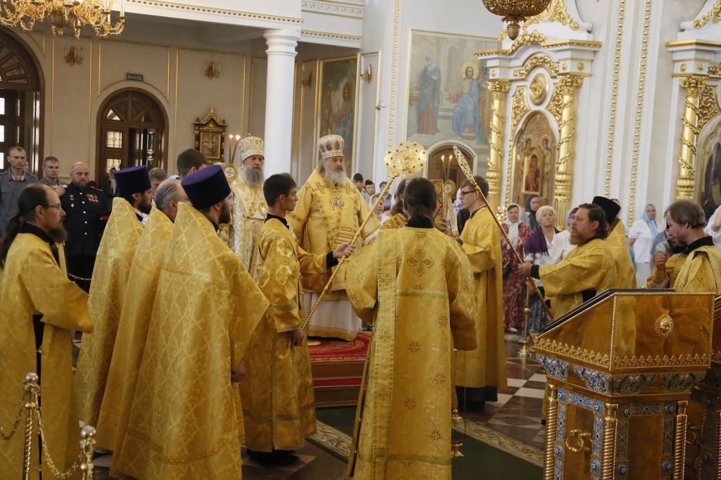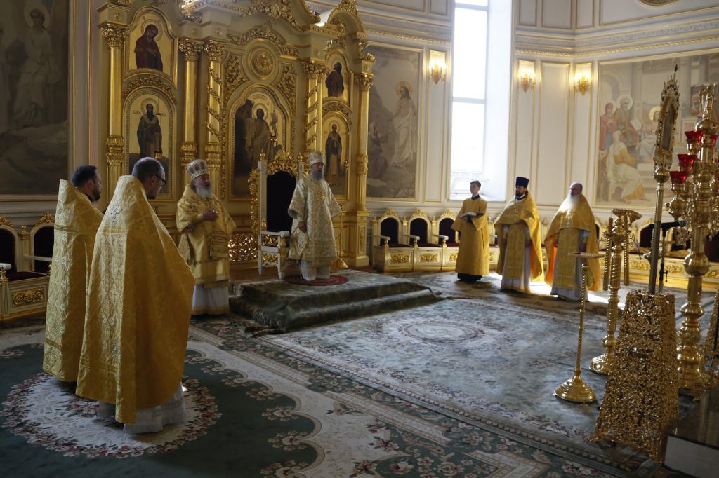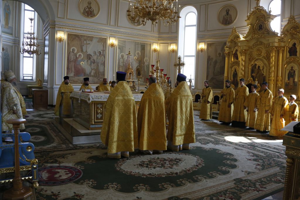 Его Высокопреосвященству сослужили Преосвященный Варнава, епископ Павлодарский и Экибастузский, секретарь Саранской епархии протоиерей Виктор Хохлов, руководитель епархиальной богослужебной комиссии иерей Максим Адамов, клирики собора.
