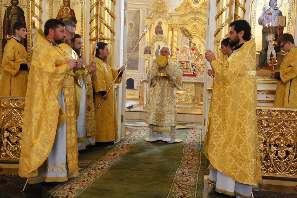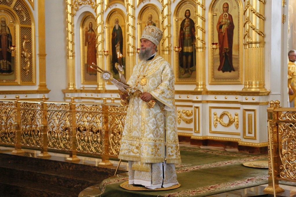 Его Высокопреосвященству сослужили секретарь Саранской епархии протоиерей Виктор Хохлов, руководитель епархиальной службы протокола протоиерей Андрей Копейкин, благочинные епархии, клирики собора.