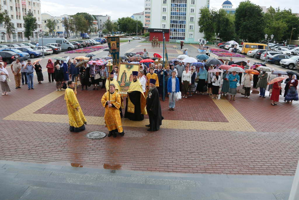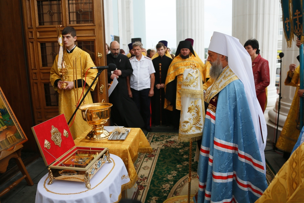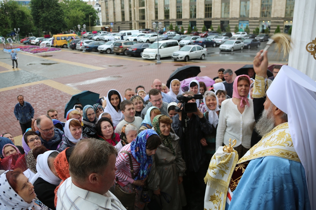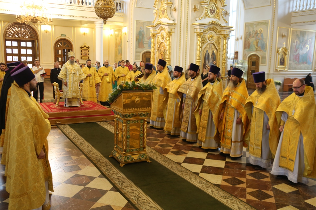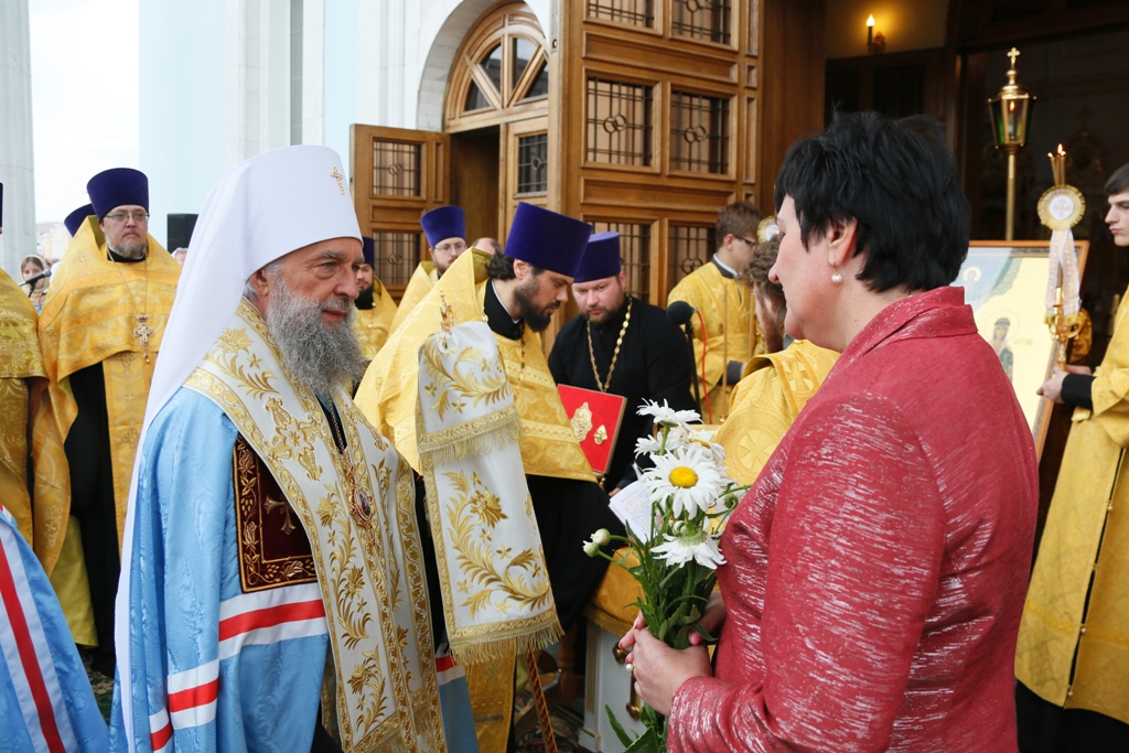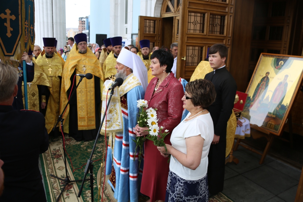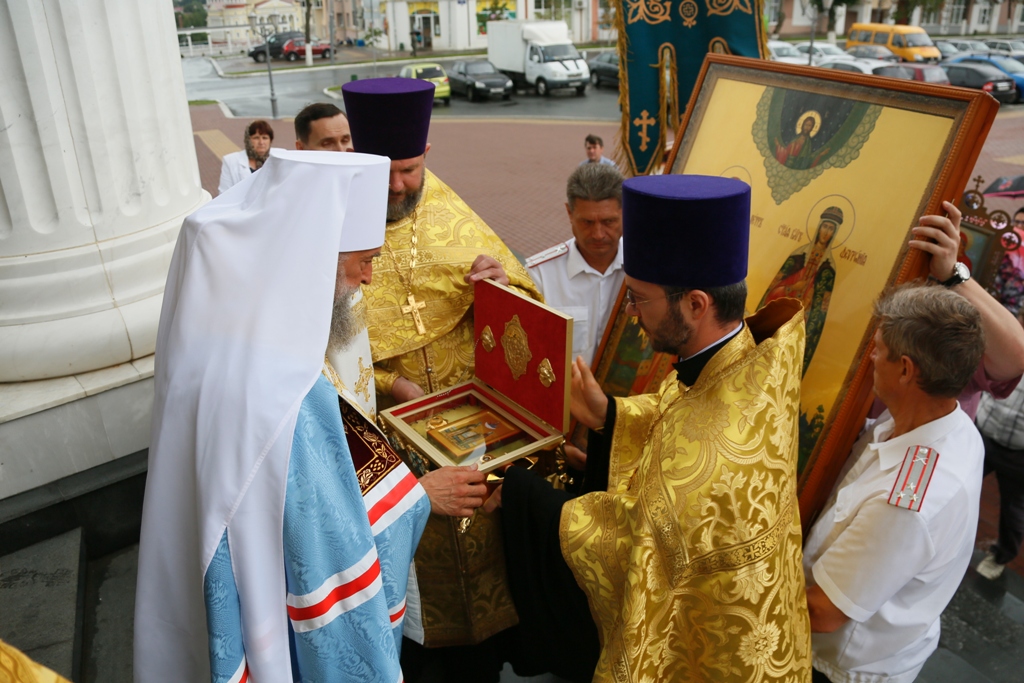 По окончании Литургии, когда к стенам собора подошли участники крестного хода от Иоанно-Богословского соборного храма, архиерей совершил молебен пред иконой с частицами мощей святых угодников.